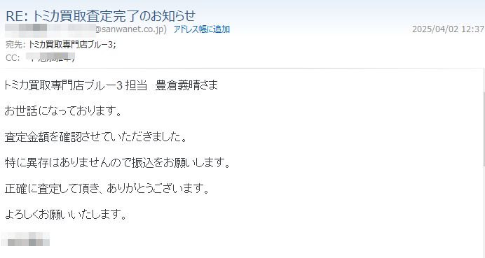 正確に査定して頂き、ありがとうございます。よろしくお願いいたします。」